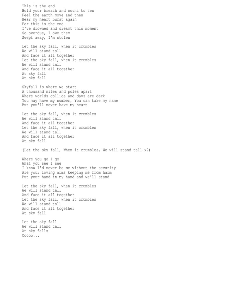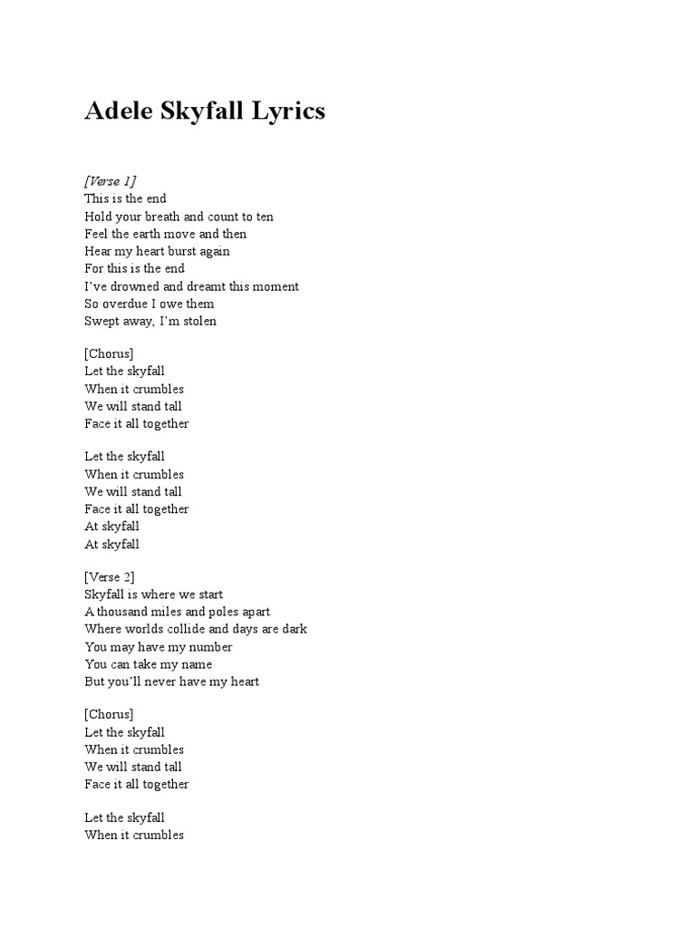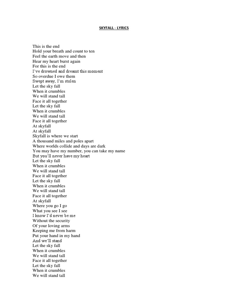 At skyfall That skyfall Skyfall is where we start A thousand miles and poles apart Where worlds collide and days are dark You may have my number you can take my name But youll never have my heart Let the sky fall let the sky fall When it crumbles when it crumbles We will stand tall we will stand tall Face it all together. The film company Eon Productions invited the singer to work on the theme song in early 2011 a task that Adele. There was plenty of action humour and Britishness everything that a Bond film needs really.